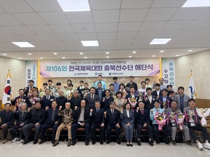올해 전국체육대회에 출전한 충북선수단이 12일 충북체육회관에서 해단식을 가졌다.해단식에 윤현우 충북체육회장, 정선미 충북도 문화체육관광국장, 김태형 충북부교육감, 선수, 지도자 등 120여 명이 참석했다.행사는 △ 단기 반환 △ 성적보고 △ 종합입상 단체 우승배 봉정 △ 입상 종목단체 및 선수·지도자 포상증서 전달 순으로 진행됐다.도체육회는 이날 종합입상 단체인 롤러스포츠연맹과 소프트테니스협회, 우슈협회, 검도회 등 4개 단체와 전년 대비 성적 향상 폭이 큰 1개 단체 등에게 포상금 7500만원을 지급했다.또한 다관왕과 메달 획득