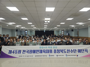 올해 전국 장애인체육대회에 출전한 충북선수단이 해단식을 가졌다.23일 충북장애인체육회에 따르면 지난 21일 충북체육회관 대회의실에서 제45회 전국장애인체전 충북선수단 해단식이 진행됐다.올해 충북선수단은 금메달 90개, 은메달 80개, 동메달 78개를 획득하며 비공식 종합 4위를 했다.이번 대회에서 38개 신기록을 쓰고 25명의 다관왕을 배출하며 충북은 장애인체육 경쟁력을 입증했다.김영환 충북장애인체육회장(충북도지사)은 "충북 선수단은 한계를 넘어서는 도전으로 도민에게 감동과 자긍심을 안겨줬다"며 "장애인체육이 더욱 활성화되고, 안정
