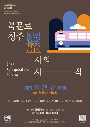 청주의 기억을 품은 ‘청주역’의 이야기가 재즈 선율로 되살아난다.청주시문화산업진흥재단은 오는 29일 오후 7시 30분 북문누리아트홀에서 재즈 창작 리사이틀 ‘북문로-청주역사의 시작’을 선보인다.이번 공연은 2025 예술경영대상을 수상한 청주문화재단의 문화기부 캠페인 ‘청주문화나눔’이 추진하는 ‘직지의 별과 함께하는 청년예술인·단체 창작활동지원’ 사업의 하나로 마련됐다.무대에는 재즈 피아니스트 조항선을 중심으로 기타 박갑윤, 베이스 김찬옥, 드럼 김효기, 보컬 이규리, 소프라노 정좋은 등 다양한 장르의 연주자들이 참여한다.공연 제목에