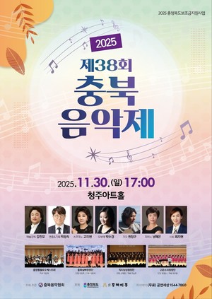 충북의 대표 음악축제, ‘2025 제38회 충북음악제’가 오는 30일 오후 5시 청주아트홀에서 열린다.충북음악협회는 지역 음악문화 활성화와 예술인의 창작활동 지원을 위해 매년 개최해 온 이 축제를 올해도 다채로운 구성으로 선보인다고 밝혔다.충북음악제는 그동안 클래식부터 전통음악까지 폭넓은 장르의 무대를 통해 충북 음악인의 창작 역량을 소개해 왔다. 올해 음악제 역시 전문 연주자와 아마추어 단체가 함께 꾸미는 공연으로, 오보이스트 박수경, 기타리스트 권정구, 소프라노 고미현, 충청필첼로오케스트라가 참여해 수준 높은 무대를 선보일 예정