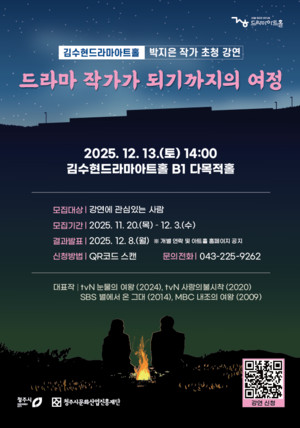 K-드라마의 흐름을 바꾼 스타 작가 박지은이 청주를 찾는다. 청주시문화산업진흥재단이 운영하는 김수현드라마아트홀은 다음 달 3일(수)까지 ‘박지은 작가 초청 강연’ 참여자를 모집한다고 25일 밝혔다.박지은 작가는 ‘내조의 여왕’(2009), ‘넝쿨째 굴러온 당신’(2012), ‘별에서 온 그대’(2014), ‘사랑의 불시착’(2020), ‘눈물의 여왕’(2024) 등 발표하는 작품마다 사회적 화제성과 기록적인 시청률을 연달아 만들어낸 국내 대표 드라마 작가다. 이번 강연은 12월 13일(토) 오후 2시, 김수현드라마아트홀 다목적홀에서