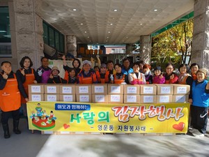 충북 청주시 상당구 영운동 자원봉사대는 11일 취약계층을 위해 직접 김장김치 60상자를 담가 홀몸노인과 장애인, 한부모 가정 등에 전달했다. /박장미기자