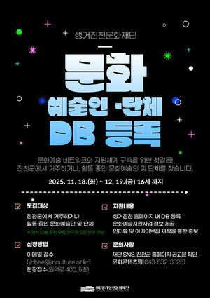 (재)생거진천 문화재단은 오는 12월 19일까지 충북 진천군 문화예술인·단체 데이터베이스(DB) 구축을 위해 등록 신청을 받는다고 23일 밝혔다.이 사업은 군에서 활동하는 문화예술인과 단체 현황을 조사·정리해 지역 문화예술인의 활동을 체계적으로 지원하고, 예술인 간 교류와 협력을 확대하기 위해 진행한다.대상은 진천군에 거주하거나 활동 중인 문화예술인과 단체, 3년 이상 활동한 경우다.재단은 향후 홈페이지(www.jinculture.or.kr)를 통해 등록된 문화예술인과 단체 정보를 현행화해 문화예술인과 단체 홍보를 종합 지원할 예정
