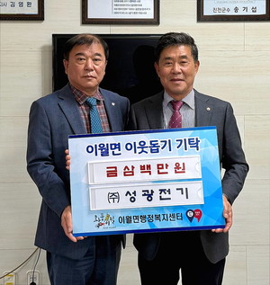 ㈜성광전기 최상욱 대표가 25일 충북 진천군 이월면에 이웃사랑 성금 300만원을 기탁해 성큼 다가온 추위를 녹여주고 있다.이월면 장학회 이사와 체육회 부회장을 맡고 있는 최 대표 꾸준한 봉사활동과 취약계층과의 상생을 실천하고 있다.최 대표는 “어려운 이웃들에게 조금이나마 도움이 되는 나눔문화가 확산되길 바란다”며 “지역사회 발전을 위해 도움이 되는 기업이 되도록 최선을 다하겠다”고 말했다. /진천=김동석기자