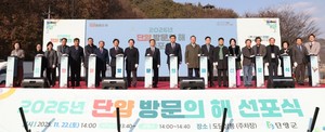 충북 단양군은 지난 22일 도담삼봉 주차장에서 ‘2026 단양방문의 해’를 공식 선포하며 머물고 싶은 관광도시로의 도약을 힘차게 알렸다.선포식에는 김문근 군수와 엄태영 국회의원, 관광업 종사자, 지역주민 등이 참석한 가운데 단양의 관광 가치와 미래 비전을 함께 공유하는 뜻 깊은 자리가 됐다.식전 공연을 시작으로 홍보영상 상영, 홍보대사 위촉식, 축하공연, 기관단체장 터치버튼 퍼포먼스가 이어졌다.이날 가수 이단양씨가 홍보대사로 위촉됐다.김문근 군수는 “단양은 천혜의 자연경관과 세계적 가치를 지닌 지질 명소를 갖춘 도시”라며 “2026