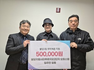 충남 천안시 불당2동은 26일 불당지웰시티푸르지오2단지 오피스텔 입주민 일동이 이웃돕기 성금 50만원을 기탁했다고 밝혔다. 기부금은 천안시복지재단에 지정기탁 되어 취약계층을 위한 지원 사업에 사용될 예정이다.채희철 불당지웰시티푸르지오2단지 오피스텔 입주민 대표는 "더불어 사는 행복한 지역이 되길 바라는 마음으로 정성을 담았다"며 "소외된 이웃들에게 조금이나마 도움이 되길 바란다"고 전했다.이성열 동장은 "힘든 시기에도 주변을 살피며 따뜻한 마음을 전해주셔서 감사드린다"며 "새해를 맞이해 어려운 이웃들에게 큰 힘이 될 것 같다"고 말