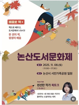 충남 논산시가 오는 8일 오전 11시부터 논산시민가족공원에서 시민이 모여 책으로 하나 되는 1회 도서문화제를 개최한다고 밝혔다.이번 도서문화제는 서울, 경기, 제주 등 전국 각지의 소형 출판사와 1인 출판사가 참여하는 독서 문화 행사다. 총 25개의 부스에서 소설, 에세이, 그림동화 등 다양한 장르의 책을 전시하며, 논산의 지역 서점도 함께해 시민과 출판인이 교류하는 책 축제의 장이 될 예정이다.이날 12시부터는 작가와의 만남이 진행된다. △다큐멘터리 걸어서 세계 속으로의 김가람 PD △그림책 바다로 가는 펭귄의 연화향 작가 △웹툰