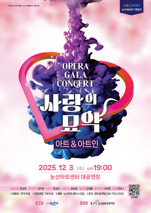 충남 논산문화관광재단이 12월 3일 19시 논산아트센터 대공연장에서 아트&아트인 오페라 사랑의 묘약 갈라 콘서트 공연을 진행한다고 밝혔다.이번 기획공연은 지역 예술인 우수 레퍼토리 지원사업의 일환으로 지역 문화예술단체 대상 공모를 통해 우수 프로그램 발굴 및 육성에 기여하고자 진행하는 사업이다. 이번에 논산시에서 활동하는 지역 문화예술단체 중 총 3팀이 선정돼 두 번째 공연을 선보이게 됐다.아트&아트인은 지역의 예술인과 청년 연주자, 그리고 시민들이 함께 참여할 수 있는 공연문화를 만들어가며, 논산의 예술적 품격과 문화적 다양성 확