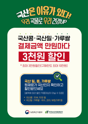 국산 밀·콩·가루쌀 소비 확대를 위한 대규모 할인 행사가 전국 유통매장에서 진행된다.농림축산식품부와 한국농수산식품유통공사(aT)는 오는 12월 15일까지 국산 원료 활용 제품 구매 시 최대 3만원까지 자동 할인 혜택을 제공하는 특별 판촉 행사를 실시한다고 밝혔다.이번 행사는 국산 밀·콩·가루쌀의 생산 기반을 강화하고 소비를 촉진해 농가 소득과 식량자급률을 높이기 위한 취지다.참여 유통업체는 공모로 선정된 GS리테일·한살림·두레생협 등 3곳이며, 총 931개 매장에서 두부, 두유, 국수, 과자 등 국산 원료 가공식품을 구매할 수 있다