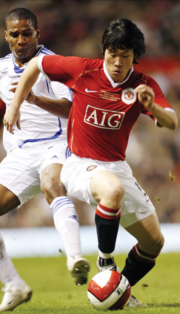 | ▲맨체스터 유나이티드의 박지성(오른쪽)이 13일 영국 런던 맨체스터의 올드 트래퍼드 홈구장에서 열린 유럽연합(eu) 출범 50주년과 맨유의 유럽클럽대항전 참가 50주년을 기념해 마련된 맨유-eu 올스타팀간 친선경기에서 유럽올스타팀의 에릭 아비달과 공을 다투고 있다. |
