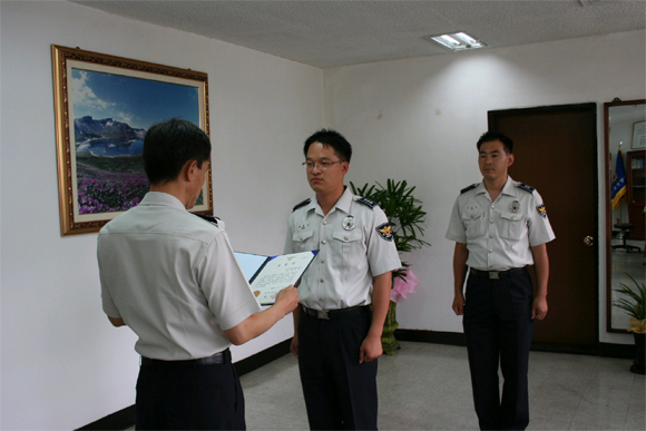 단양경찰서(서장 정승용)는 지난 20일 새벽 12시50분경 단양군 단양읍 별곡리 소재에서 112순찰 근무중 절취한 오토바이를 운행하던 특수절도 피의자 안모씨(16세)등 3명을 검거한 중앙지구대 박유신 경장과 김인규 순경에게 표창장을 수여하고 격려했다.