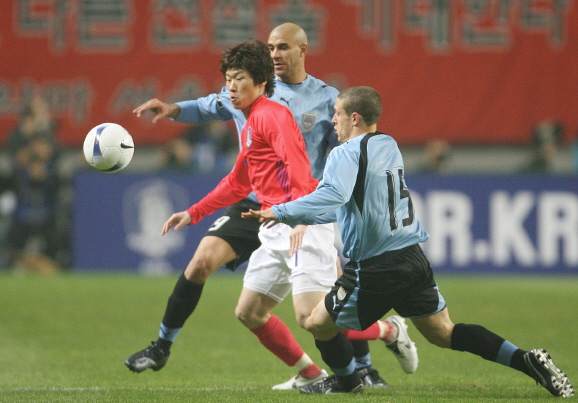 | ▲24일 서울 상암동 월드컵경기장에서 열린 우루과이와의 평가전에서 한국 박지성이 우루과이 페레즈와 볼을 다투고 있다. 이날 경기에서 한국팀은 우루과이에 2-0으로 패했다.©연합뉴스 |