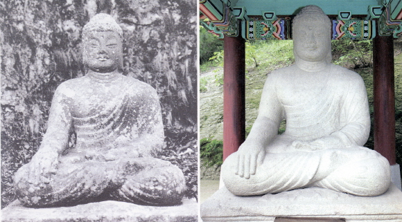 높이 약 130㎝에 서울시유형문화재 제24호인 이 석조여래좌상(石造如來坐像)은 경주 남산에서 1912년에 옮겨온 것으로 지금의 대통령 관저 자리에 있다가 1989년 관저 신축 때 지금의 북악산 기슭으로 옮겼다. 우견편단(右肩偏袒) 법의(法衣)에 항마촉지인(降魔觸地印)이다. 왼쪽은 조선고적도보(朝鮮古跡圖譜) 제5책(1917)에 수록된 이 불상이며 오른쪽은 2007년 보존처리를 끝낸 뒤 모습이다.