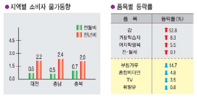 충남은 귤 23.9%, 사과 13.4%, 가정학습지 8.3%씩 오른 반면 이동전화데이터통화료 6.4%, 돼지고기 3.1%, 휘발유 0.9%씩 하락한 것으로 나타났다.