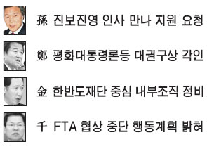 우리당 김근태 전 의장과 민생정치모임 천정배 의원은 금주에는 사회단체 등과 보조를 맞춰 한미 자유무역협정(fta) 협상 중단을 촉구하는 활동에 전력투구하기로 했다. 김 전 의장은 한미 fta에 반대하는 의원들을 규합해 국회내에서 본격적으로 목소리를 내는 한편, 자신의 지지조직인 한반도재단을 중심으로 내부 조직 정비에 착수했다.