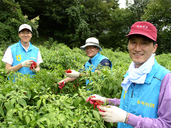 충북농협 임직원 20여명은 4일 1사1촌 자매마을인 괴산군 청천면 사기막리 마을에서 고추따기와 브로커리 심기, 오미자밭 잡초제거 등 농촌 일손을 도왔다.