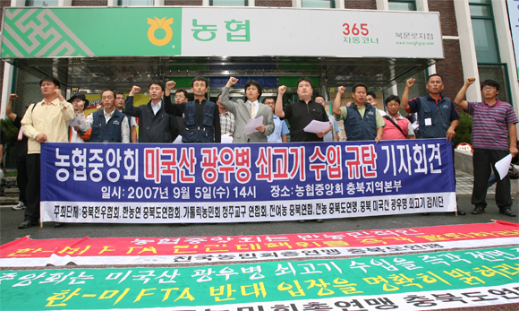 전국농민회총연맹 충북도연맹은 5일 농협중앙회 충북지역본부에서 기자회견을 갖고 농협중앙회의 미국산 광우병 쇠고기 수입 즉각 중단을 촉구했다.