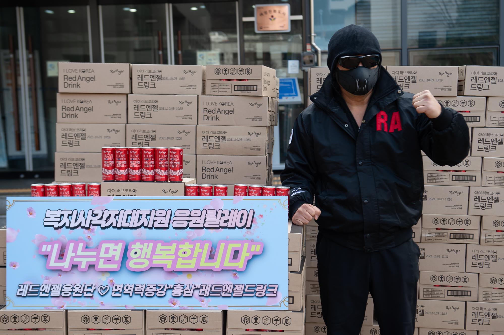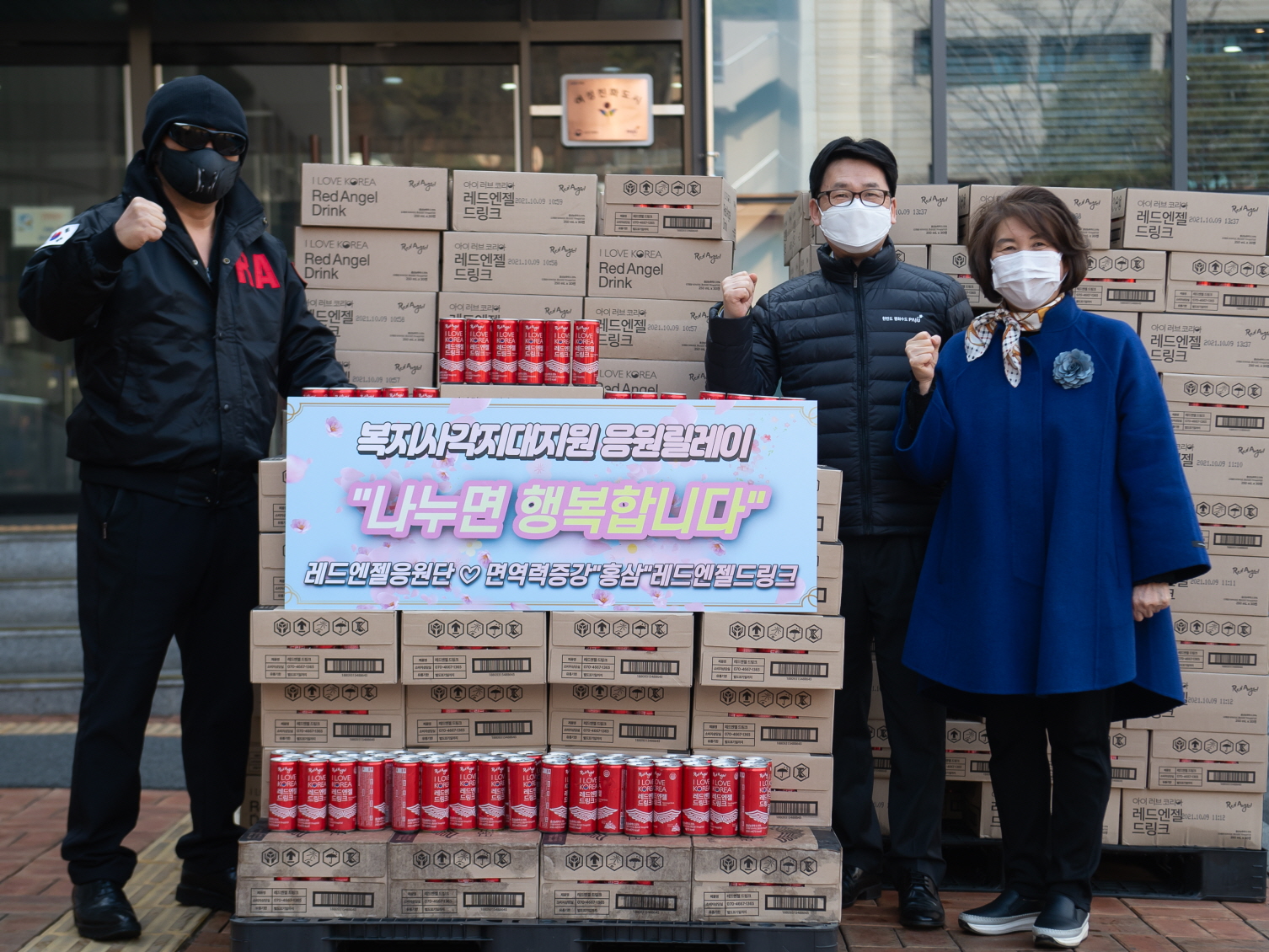 레드엔젤응원단(명예회장 배우 김보성) 은 지난 19일 한반도 평화수도인 파주시에 천만원 상당의 홍삼음료를 전달하며 <복지사각지대 응원릴레이> 의 서막을 열었다.