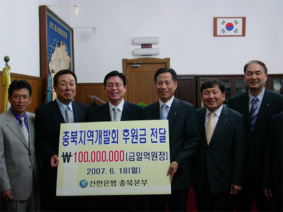 2007년 4월 충청북도 장애인 체육회 휠체어 구입자금 4000만원 , 2007년 6월 충북지역개발회 발전기금 1억원을 지원했다.