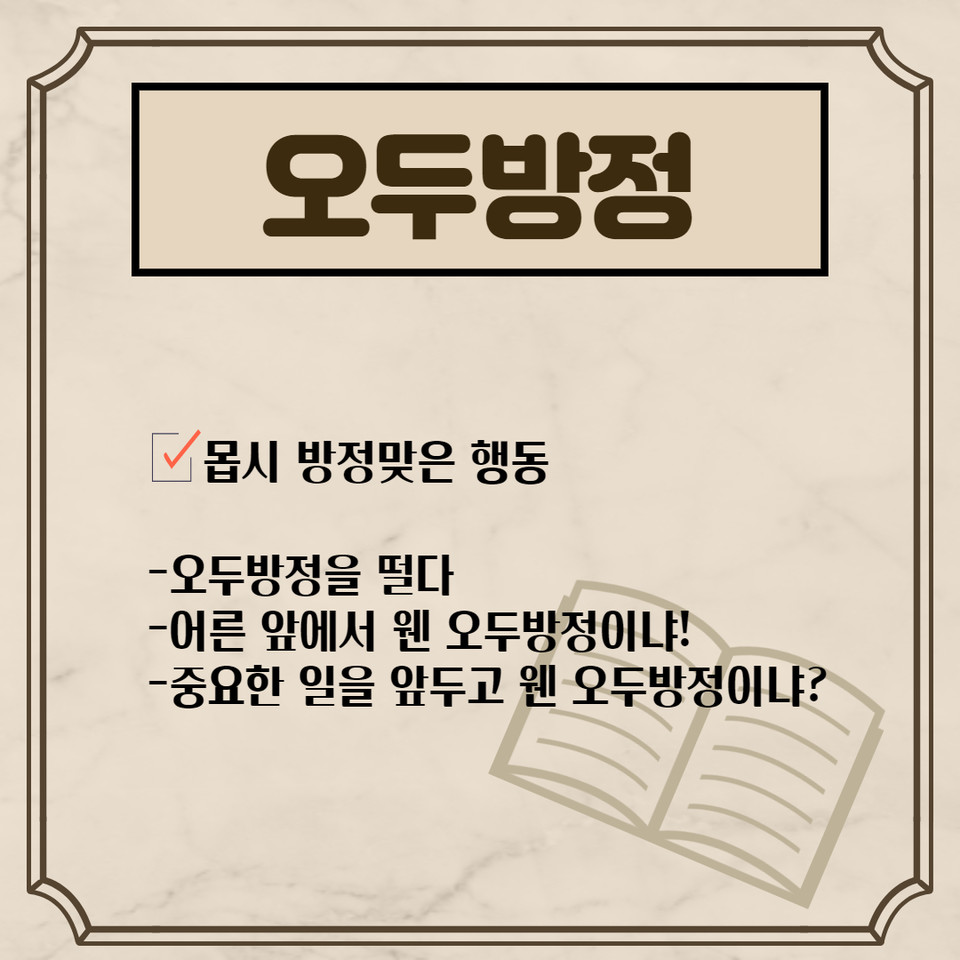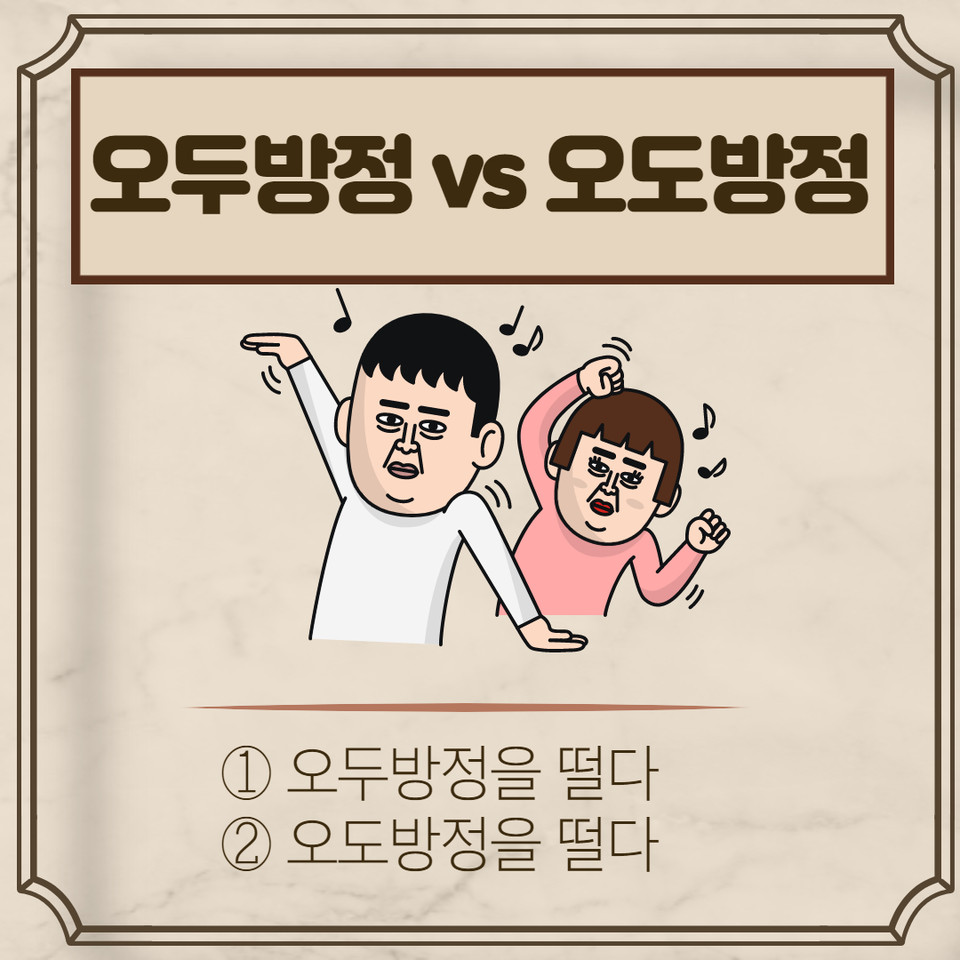 말이나 행동이 부산스럽거나 몹시 까불며 점잖지 못한 모습을 가리켜 '오두방정을 떤다'고 표현하는데요. 흔히 사용하는 표현이지만 '오두방정'과 '오도방정'은 헷갈리는 맞춤법 중 하나입니다. '오도방정'은 우리말의 모음조화를 지켜 쓰임이 자연스러워 보이지만 '몹시 방정맞은 행동'의 뜻을 가진 '오두방정'이 표준어입니다.