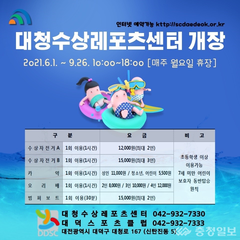 대전시 대덕구 수상레저 시설인 대청수상레포츠센터가 오는 9월 26일까지 운영에 들어간다.