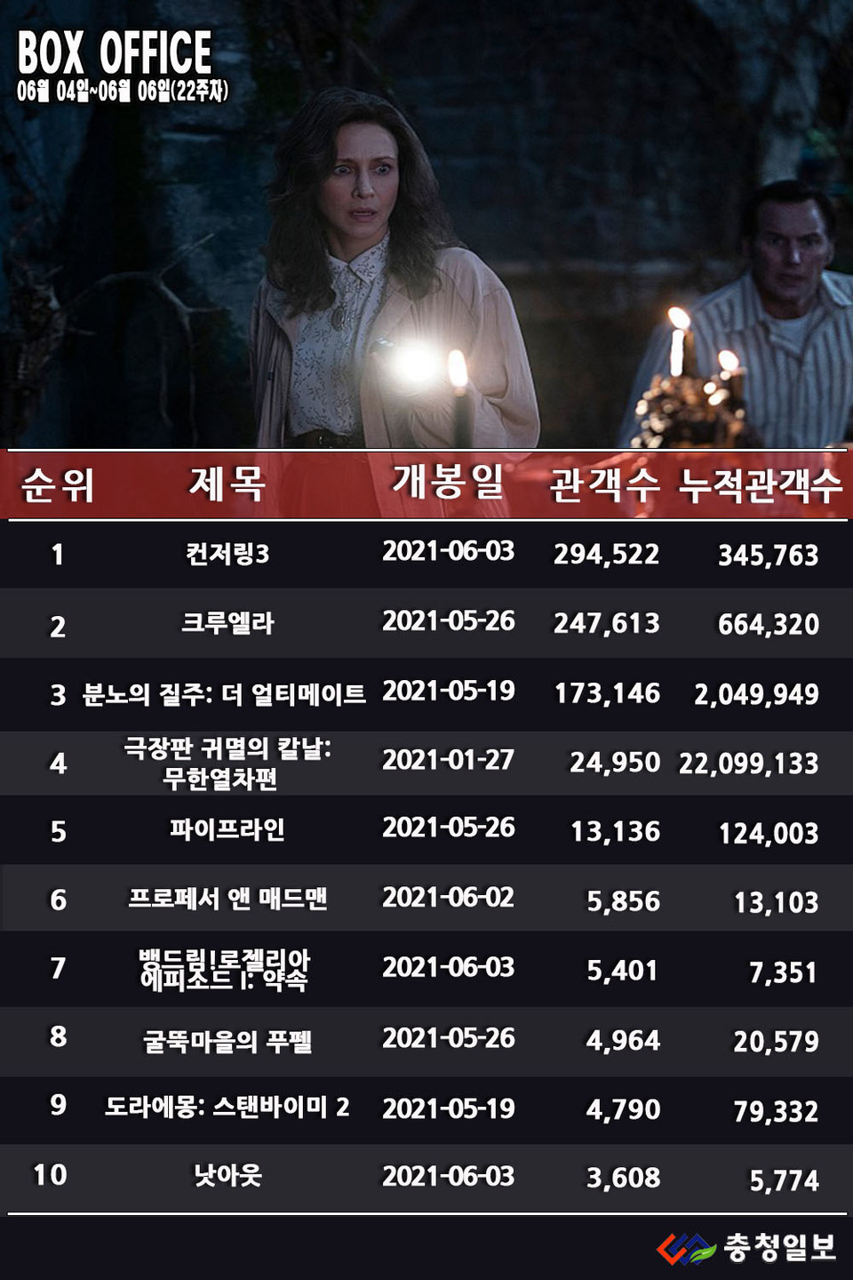 디즈니 실사 영화 ‘크루엘라’가 같은 기간 관객 24만7613명이 관람하며 2위를 유지했다. 누적관객은 66만4320명이다.