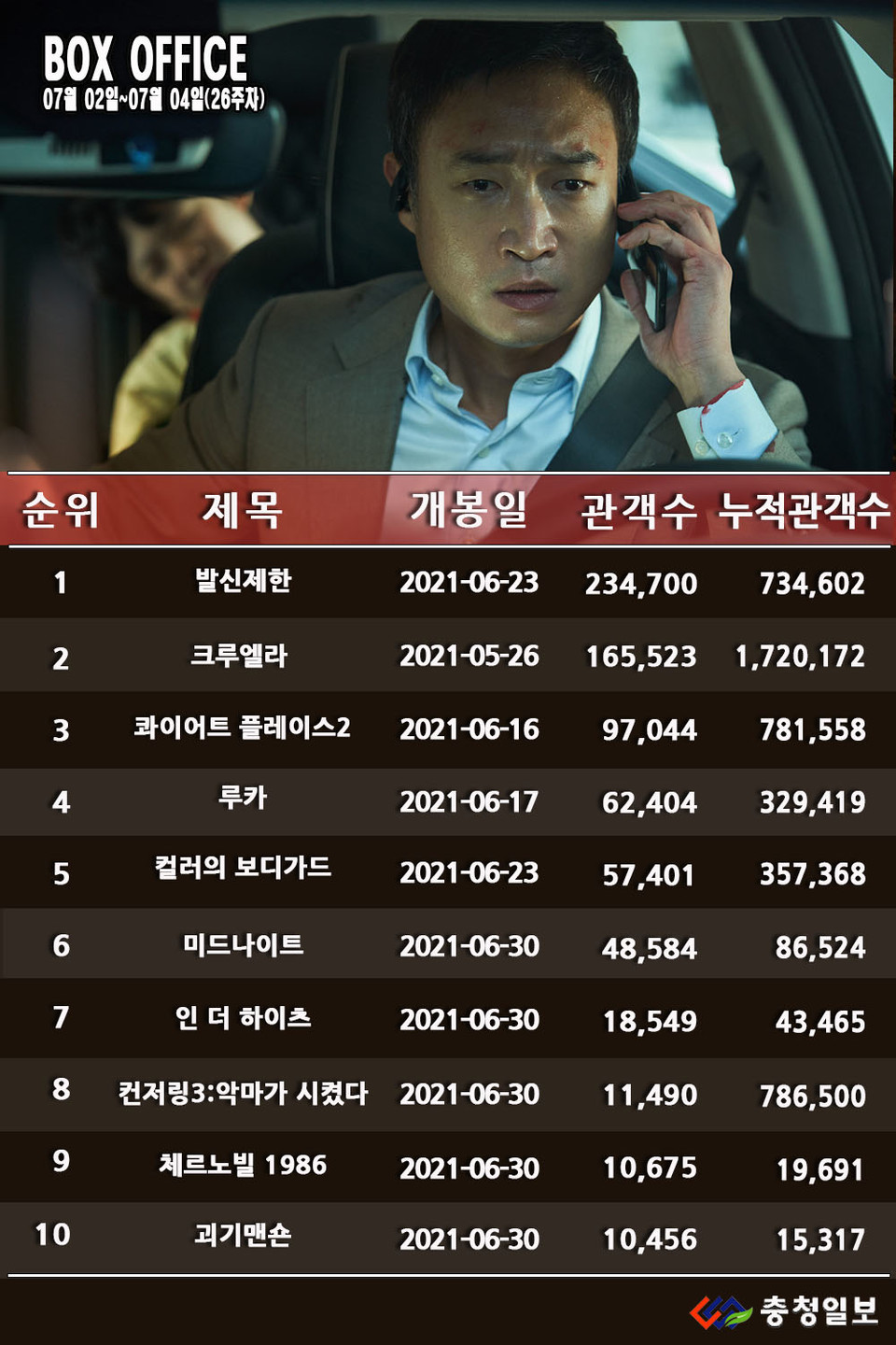 3위는 공포영화 ‘콰이어트 플레이스2’가 관객 9만7044명이 관람하며 누적관객 78만1558명을 기록했다. 지난주 4위에서 3위로 순위 상승했다.