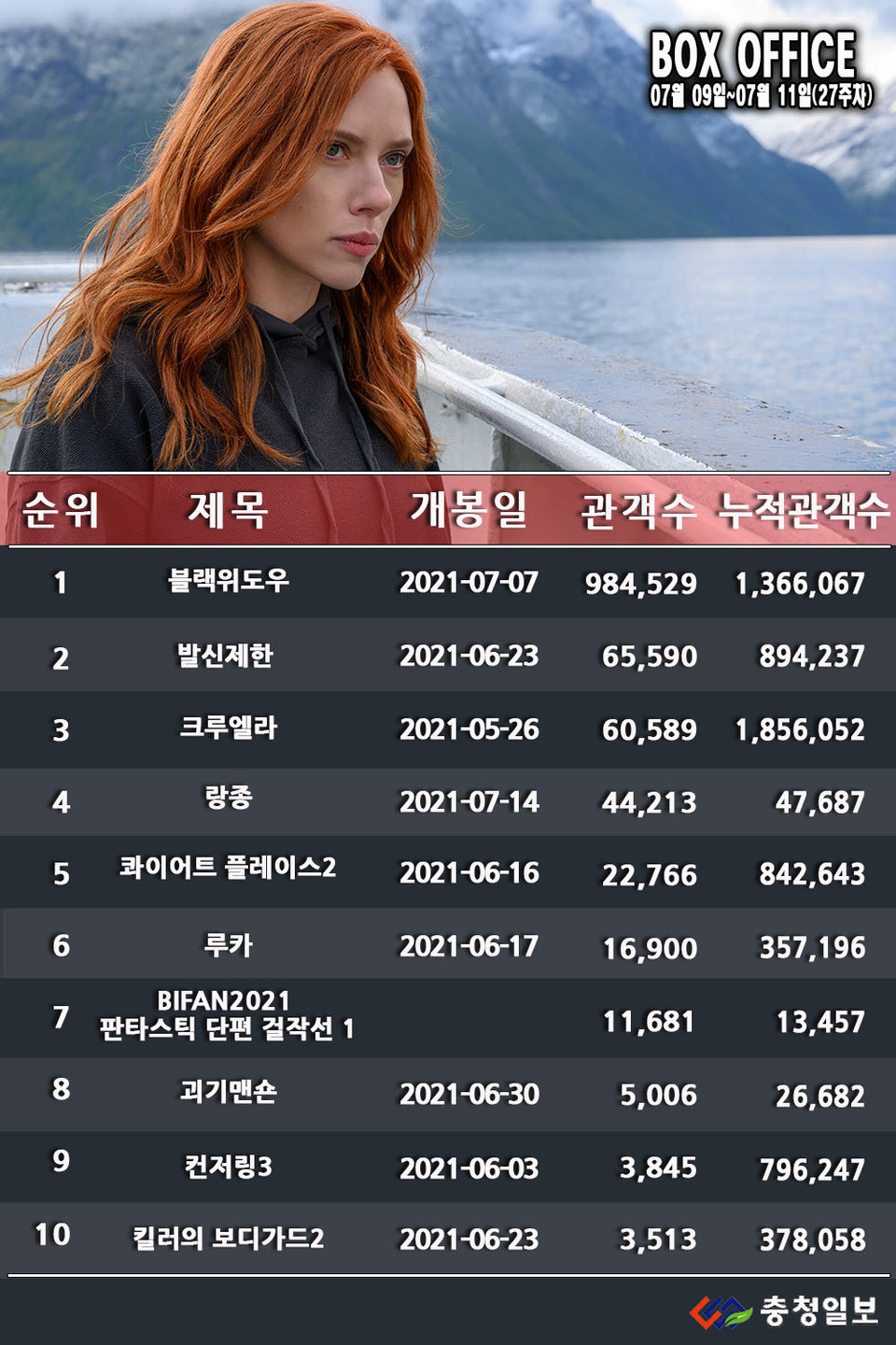 12일 영화진흥위원회 영화관입장권통합전산망에 따르면 ‘블랙위도우’는 지난 주말(9~11일)기간 관객 98만4527명을 동원하며 누적관객 136만6067명을 기록했다.