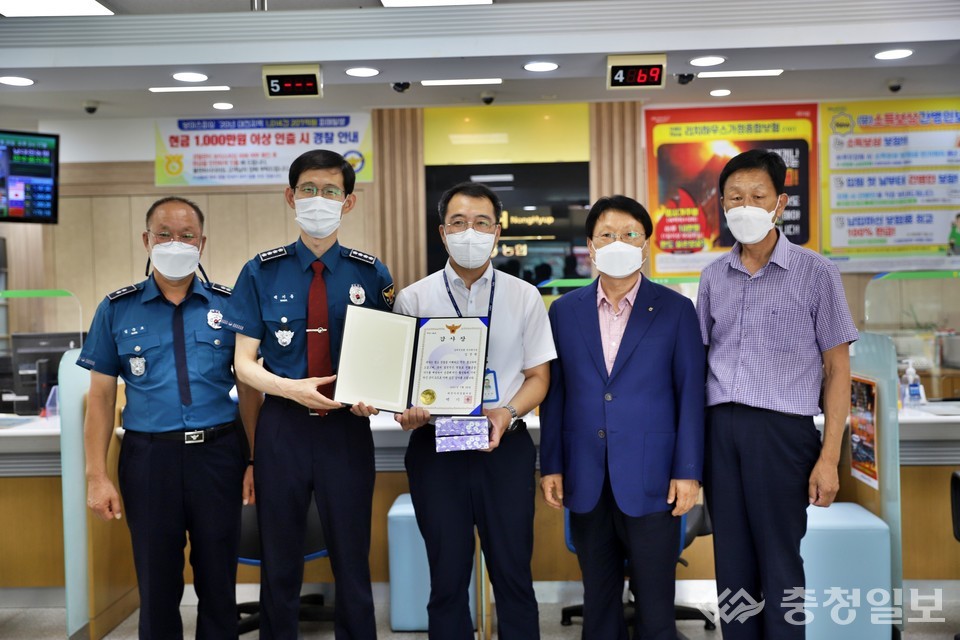 지난 28일 남대전농협 김정원 직원(과장보)은 60대 여성 고객이 영업점을 방문해 정기예금을 중도해지 3500만원을 현금 인출할 것을 요청하자, 거래목적이 불분명하고 식은땀을 흘리며 떨리는 손으로 전표작성을 하는 모습에 수상함을 느껴 경찰에 신고했다.