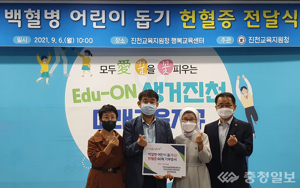 충북 진천군 학교운영위원회협의회와 학교학부모연합회는 지난 6일 진천교육지원청 행복교육센터 시청각실에서 백혈병 어린이 돕기 헌혈증 전달식을 열었다.