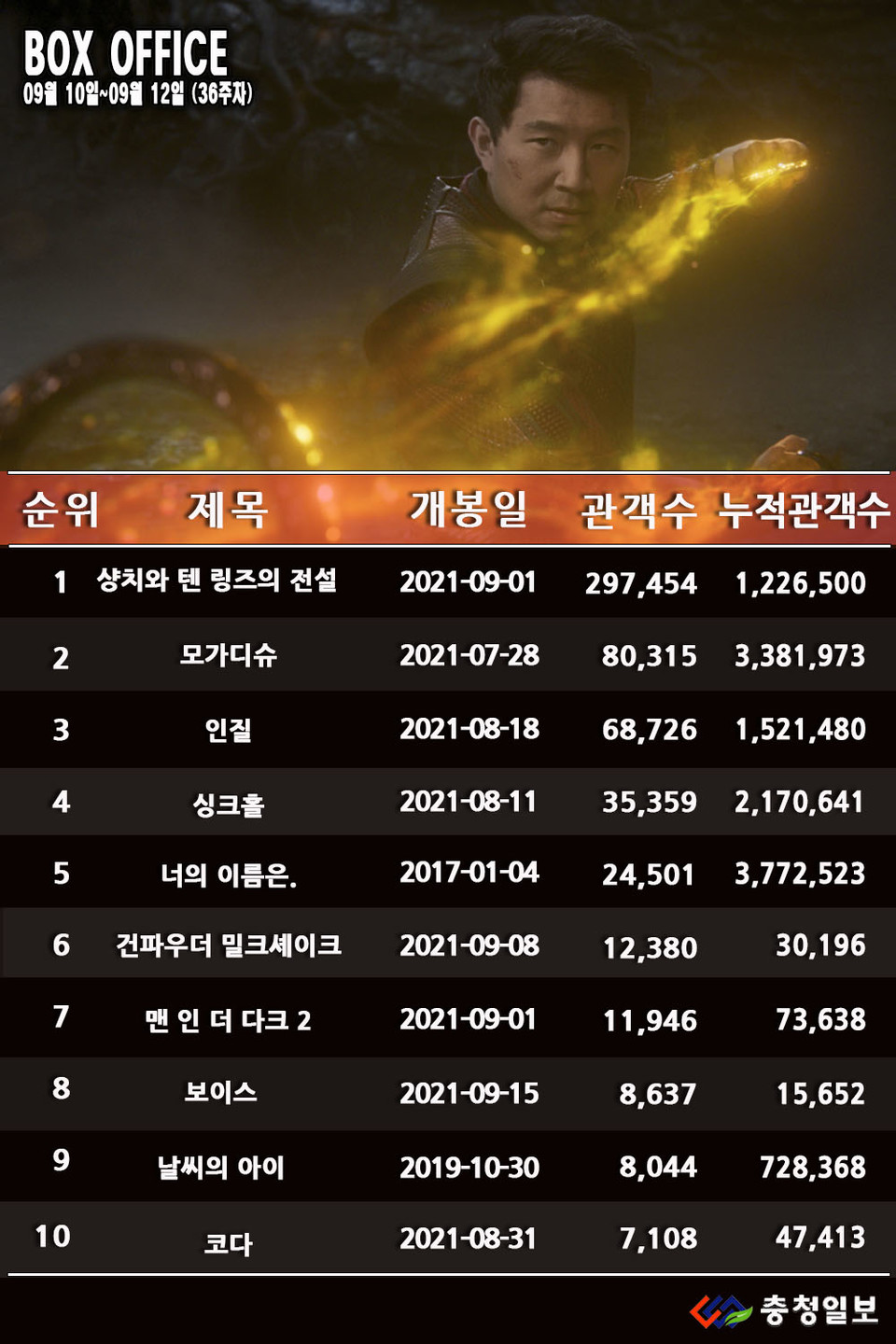 마블 영화 ‘샹치와 텐 링즈의 전설’이 2주 연속 주말 박스오피스 정상을 지켰다.