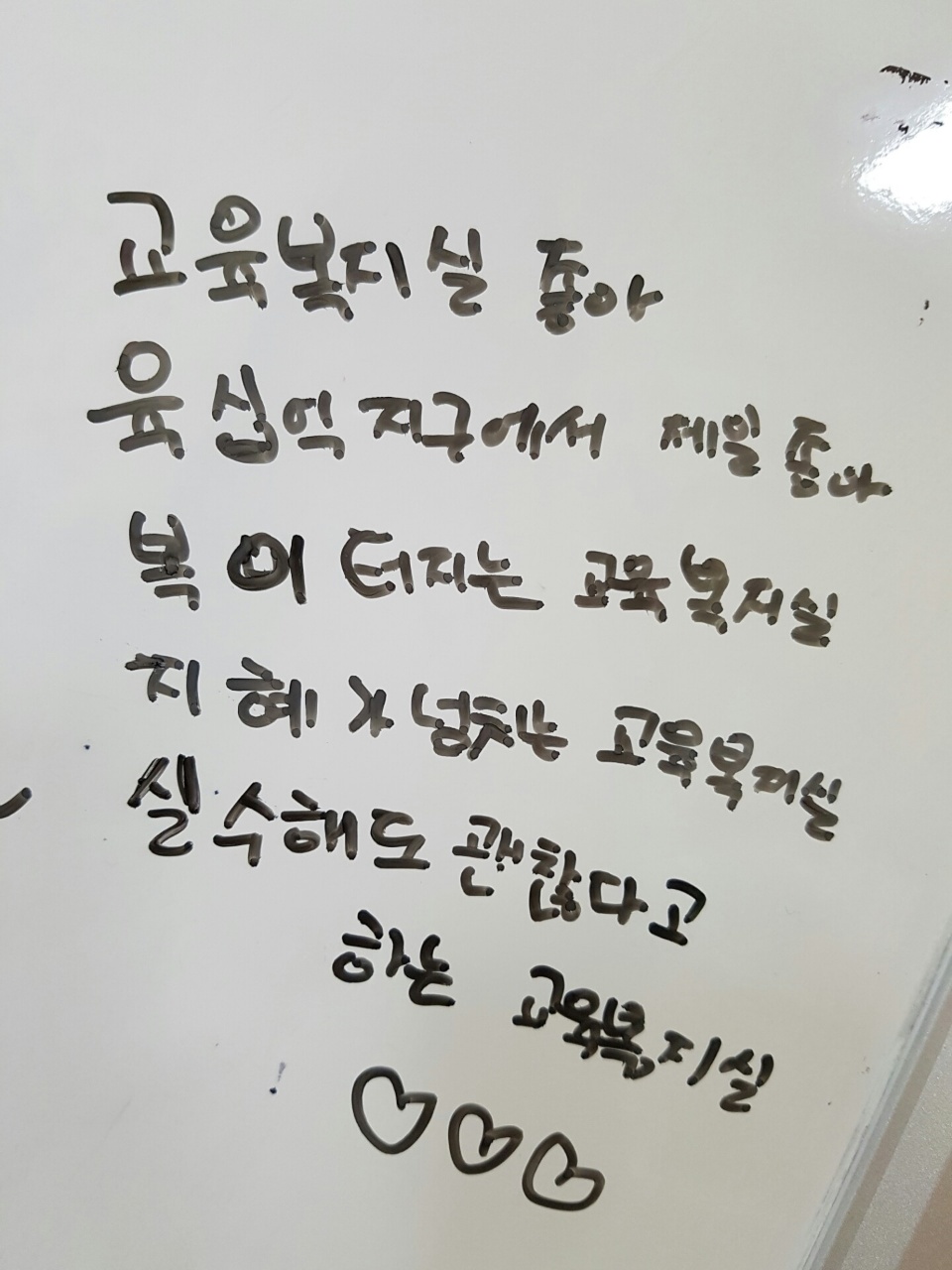 교 : 교육복지실 좋아 / 육 : 육십억 지구에서 제일 좋아 / 복 : 복이 터지는 교육복지실 / 지 : 지혜가 넘치는 교육복지실 / 실 : 실수해도 괜찮다고 하는 교육복지실 //