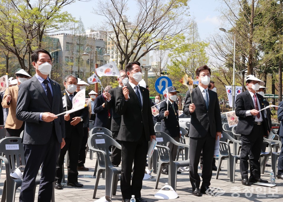 대전시의회 권중순 의장(사진 앞줄 왼쪽 두 번째)이 11일 대전 보라매 근린공원에서 열린'103주년 대한민국임시정부 기념식'에 참석했다. 이 자리에서 권 의장은 "지금의 대한민국은 많은 분들의 숭고한 희생이 있었기에 가능한 것"이라며"오늘 뜻깊은 날을 맞아 순국선열의 숭고한 뜻과 고귀한 희생을 잊지 말자"고 말했다. 이어 "대한민국 임시정부 수립의 큰 의미를 다시 한번 마음속에 새기면서 더욱 발전하는 대한민국, 희망의 대한민국을 만들자"며 만세삼창을 외쳤다. /이한영기자