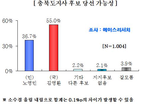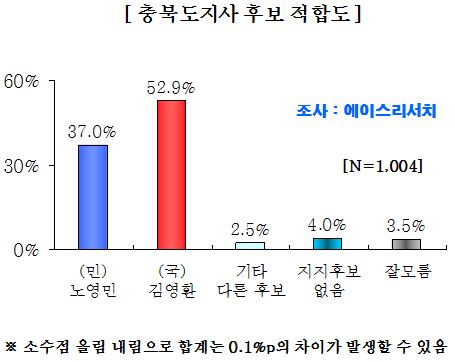 충북기자협회가 에이스리서치에 의뢰해 지난 4월 30일~5월 1일까지 2일간 충북도에 거주하는 만 18세 이상 유권자 1004명을 대상으로 실시한 충북도지사 선거 여론조사에서 국민의힘 김영환 후보가 52.9%의 지지율을 기록했다.