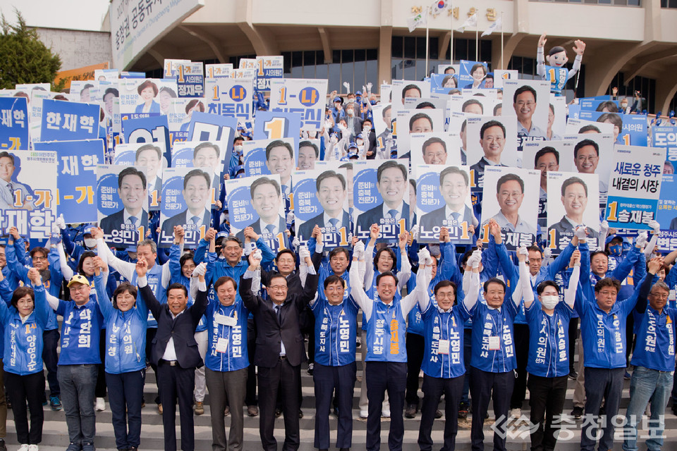 민주당은 청주실내체육관 광장에서 노영민 충북지사 후보, 송재봉 청주시장 후보 등 청주권 후보 전원 등 350명 이상 참석한 가운데 선거운동 출정식을 열었다.