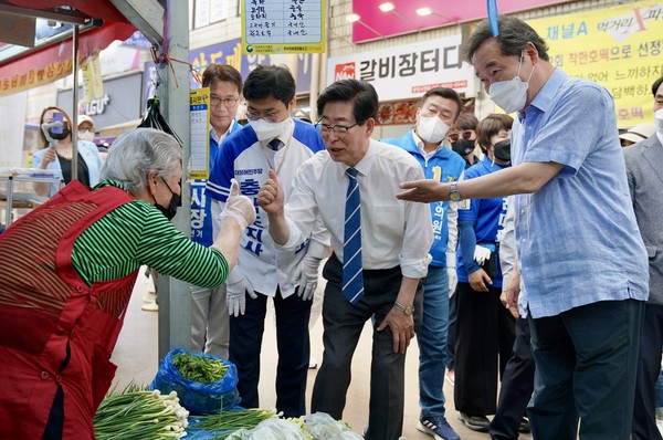 이낙연 전 총리는 28일 오전 11시 천안 중앙시장에서 열린 양승조 충남도지사 후보 지지유세에서 "양 후보는 겉은 솜같이 부드럽지만 속은 쇳덩어리 같은 후보"라며 천안시민들의 흔들림 없는 지지를 부탁했다.