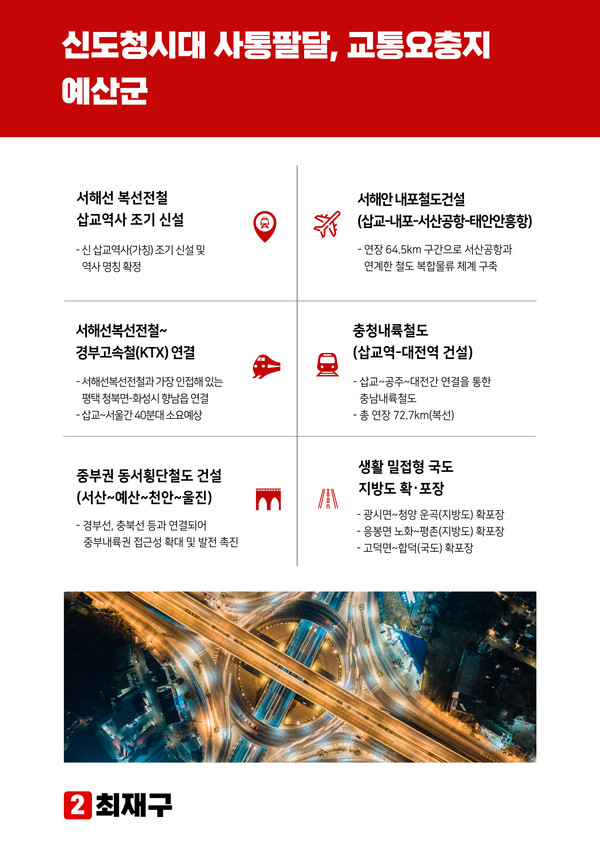이외에도△서해선복선전철 삽교역사 조기 신설,△중부권 동서횡단철도 건설(서산~예산~천안~울진),△충청내륙철도 건설(내포~대전역)△서해안 내포철도 건설(삽교~내포~서산공항~태안안흥항)뿐만 아니라 생활 밀접형 국도 지방도 확·포장(광시면~청양 운곡, 응봉면 노화~평촌, 고덕면~합덕 확포장)을 통해 신도청 시대에 걸맞는 교통의 요충지 예산군으로 변모시켜 나가겠다는 입장을 밝혔다.