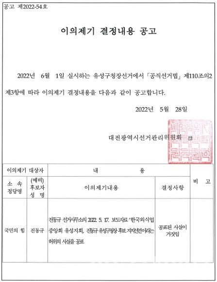 30일 더불어민주당 정용래 캠프에 따르면, 대전시선거관리위원회는 지난 28일 과거 진동규 후보가 배포했던 보도자료 '한국외식업중앙회 유성지회, 진동규 유성구청장 후보 지지선언'의 내용이 허위사실로 결정됐다고 밝혔다.