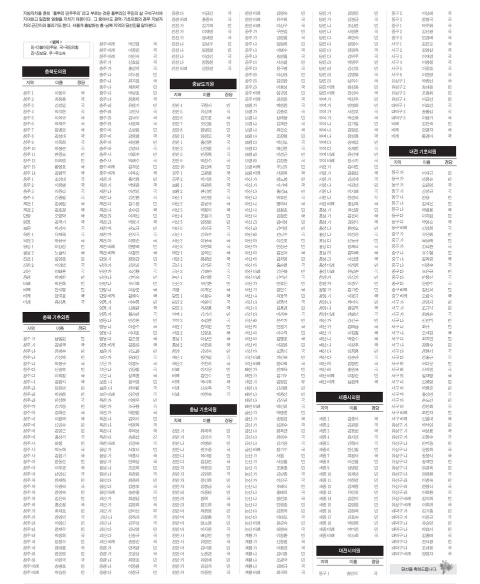 지방자치를 흔히 '풀뿌리 민주주의'라고 부르는 것은 풀뿌리인 주민의 삶 구석구석에 지대하고 밀접한 영향을 끼치기 때문이다. 그 중에서도 광역·기초의회의 경우 지방자치의 근간이라 불리기도 한다. 새롭게 출발하는 충·남북 지역인의 당선인을 알아본다.