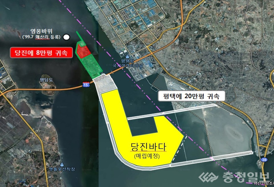 같은 장소의 동일한 공유수면이 매립하지 않으면 당진 바단데 매립하면 평택 땅이 되는 기현상이 빚어지고 있다.