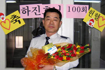 부산 동부경찰서 수성지구대에 근무하는 하진호(52) 경장은 27일 부산혈액원에서 100번째 헌혈을 했다.