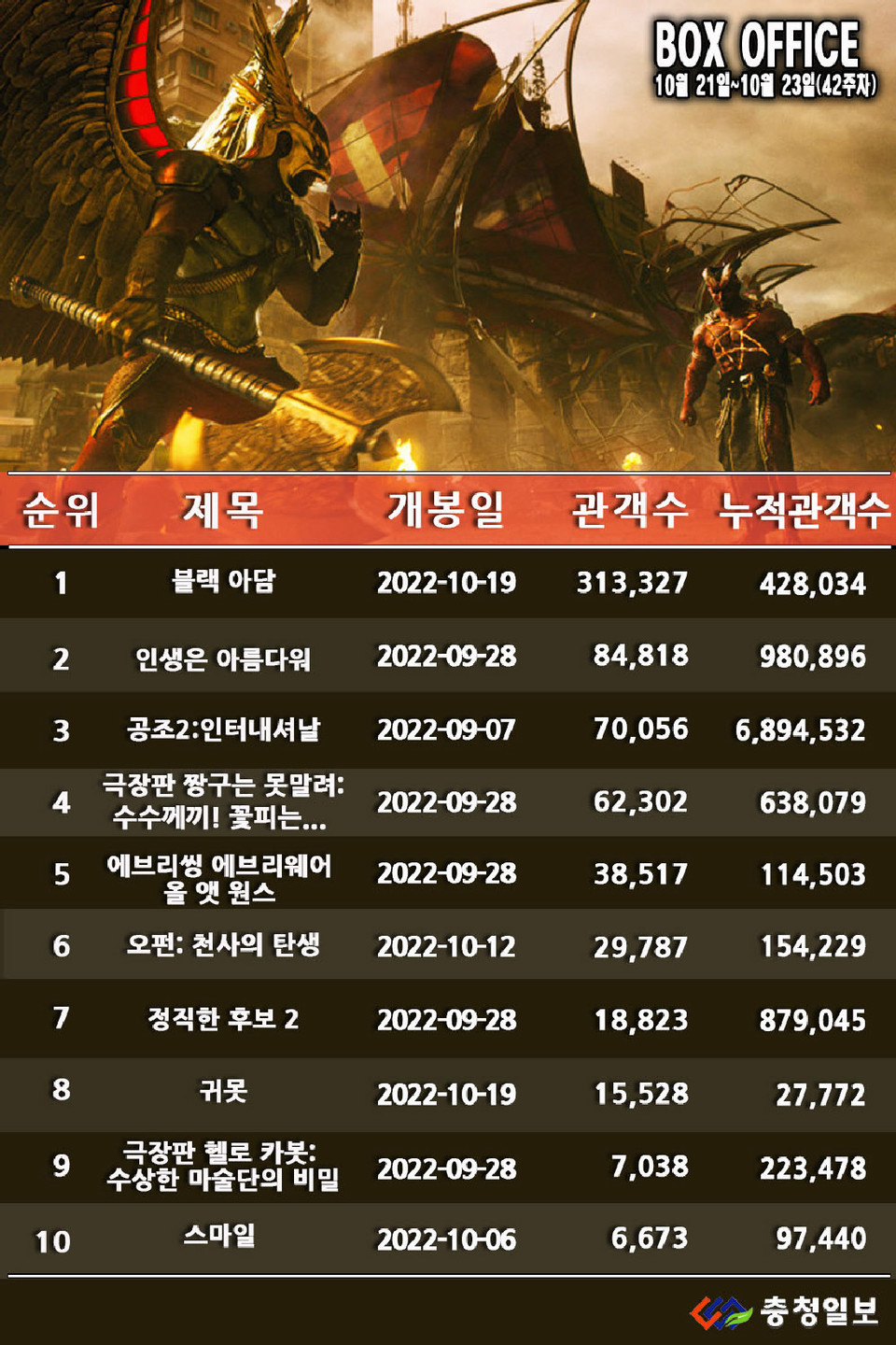 24일 영화진흥위원회 통합전산망에 따르면 ‘블랙 아담’은 지난 주말 (21~23일)기간 관객 31만3327명을 동원하며 누적 관객 42만8034명을 기록했다.