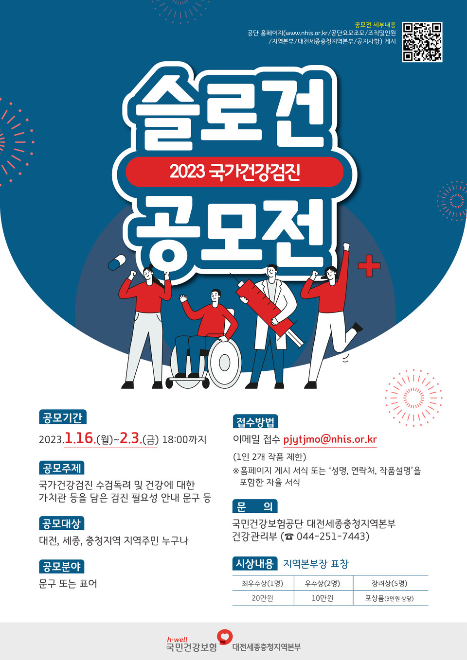 입상작은 2023년 국가건강검진 홍보, 수검독려 캠페인 등에 활용될 예정이며, 공모전에 대한 자세한 사항은 대전세종충청지역본부 건강관리부(044-251-7443)로 문의하면 된다.