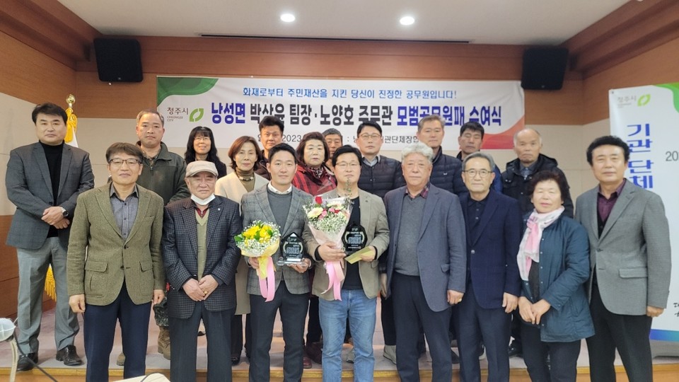 축사 화재 당시 긴박한 상황 속 염소 200마리를 구출해 낸 충북 청주시 낭성면행정복지센터 박상윤 팀장과 노양호 주무관이 지난 2월 28일 낭성면 기관·단체장협의회로부터 모범공무원패를 받았다. 이들은 위험을 무릅쓰고 화재 속으로 뛰어 들어가 8000만원 상당의 주민 재산피해를 막아냈다.