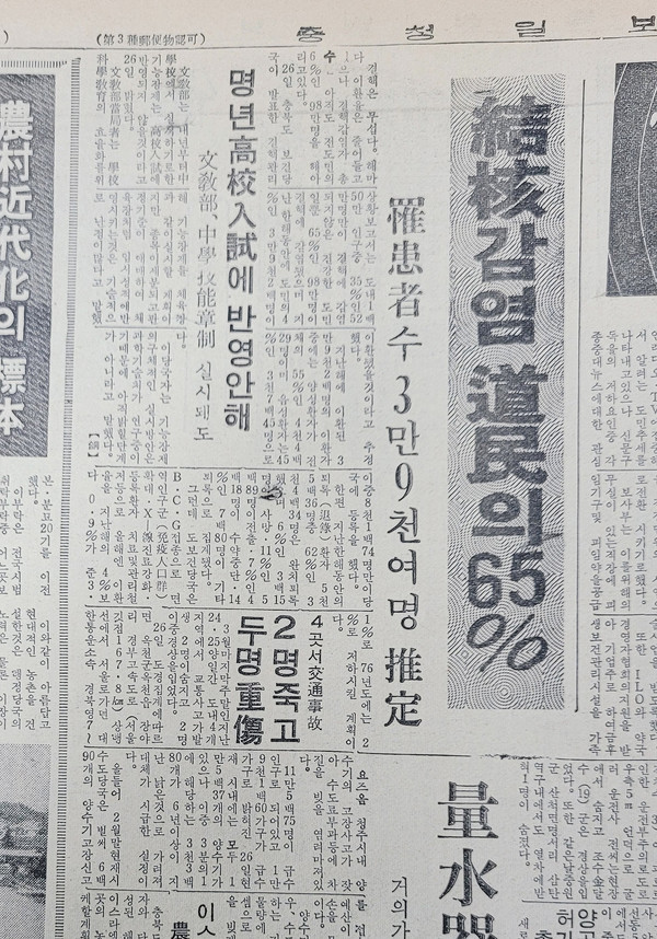 50년 전 기사를 보니, 당시 충북 인구인 150만명 가운데 65%인 98만명이 감염됐었다고 한다. 그 수가 어마어마하다.