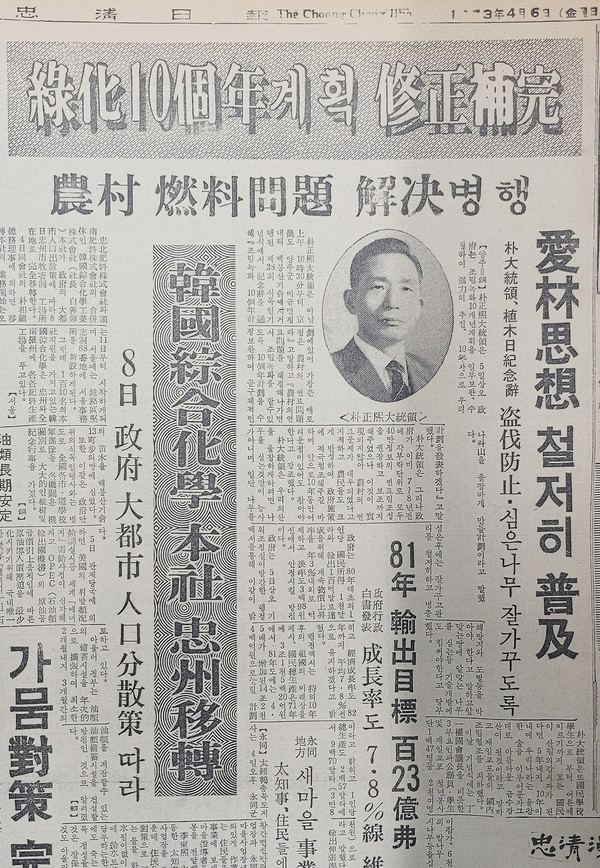 朴正熙 大統領은 이날 上午(상오) 10時(시) 30分(분)부터 京畿(경기)도 양주군 미금면 평내리 백봉산 기슭에서 거행된 제28회 식목일 기념식에서 記念辭(기념사)를 通(통)해 “조림녹화 10個年(개년) 計劃에 있어 가장 큰 애로점은 農村(농촌)의 연료 問題(문제)”라고 말하고 “農村의 연료 問題를 해결해 나가면서 조림녹화를 할 수 있도록 10個年 計劃을 수정 보완하여 곧 구체적인 計劃을 發表(발표)하겠다”고 말했다.