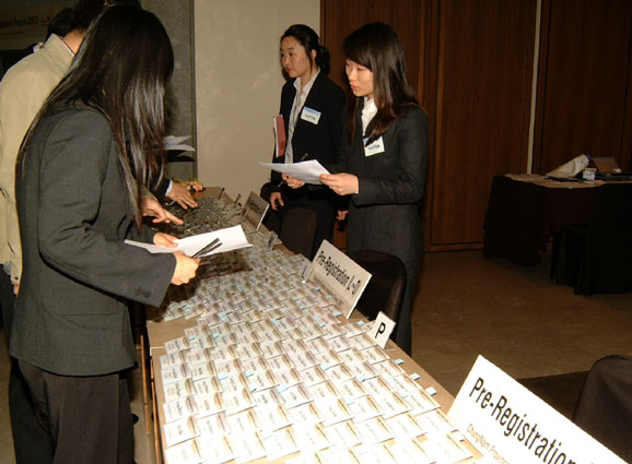 | ▲투자설명회 안내테스크에 놓인 400여개의 기업 명찰들. 설명회가 시작되고 대부분의 기업 관계자들이 명찰을 찾아가 기업들이 충남도에 대한 관심이 높았음을 알 수 있다. |