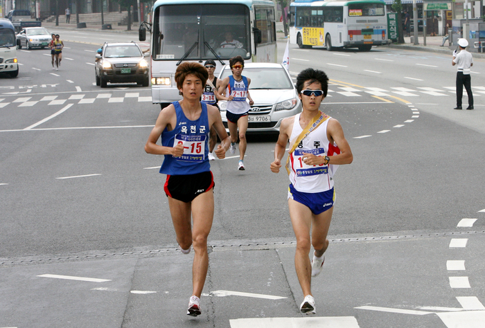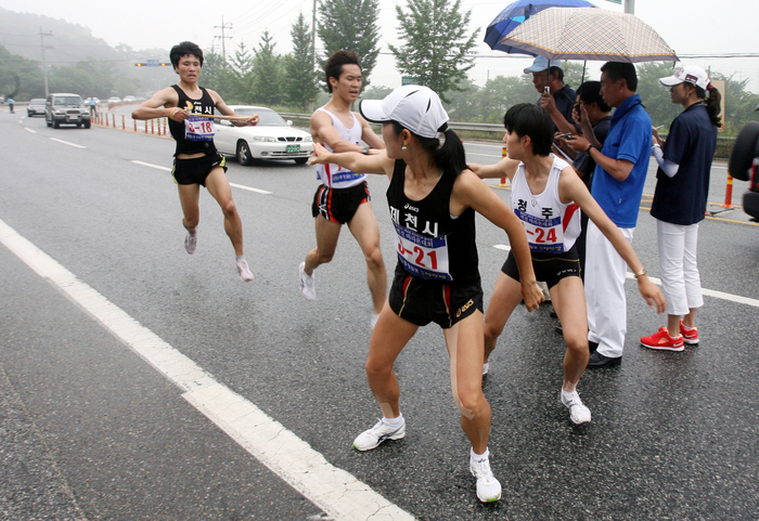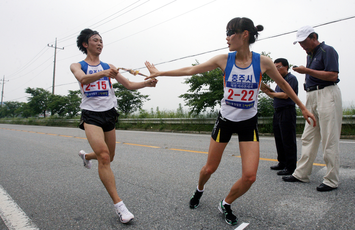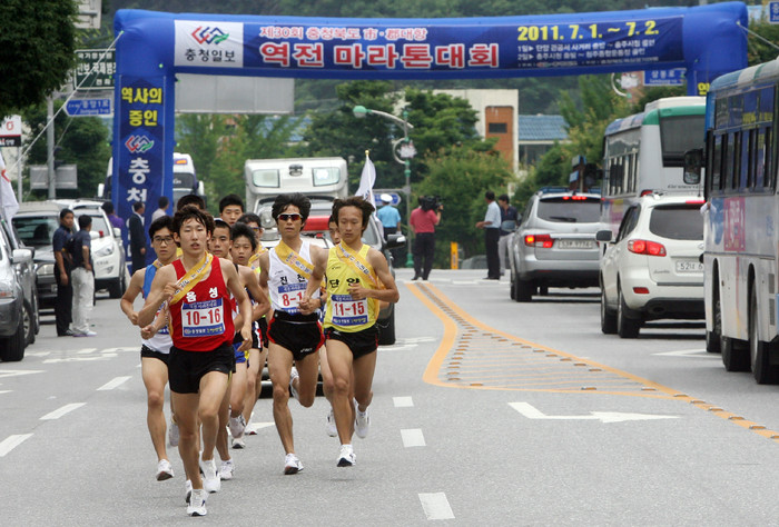 충북건각이 총 출동한 30회 충북시·군대항 역전마라톤대회에서 충주시가 2연패를 달성하며 지난1~2일 이틀간의 경기 일정을 마쳤다. 11개 시.군 선수단은 단양을 출발해 제천, 충주, 음성, 청주에 이르는 167.4km구간에서 자신과의 외로운 싸움을 이겨냈다. 강한 정신력과 승부욕으로 무장한 선수단과 대회를 빛낸 영광의 주인공들의 표정을 카메라에 담았다. ▲ 충주시 선수가 다음 구간 선수에게 어깨띠를 넘겨 주고 있다. © 편집부▲ 선수들이 우승을 향해 힘차게 달리고 있다. © 편집부▲ 제천시 선수단 코치가 등에 업혀 힘들어 하는 선수를 걱정하고 있다. © 편집부▲ 충북 건각들이 힘찬 레이스를 펼치고 있다. © 편집부▲ 이규택 충청일보 회장(오른쪽)이 선수를 응원하며 박수 치고 있다. © 편집부▲ 단양지역 학생들이 마라톤 선수들을 응원하고 있다. © 편집부▲ 스트레칭으로 몸을 풀고 있다. © 편집부▲ 청주시와 제천시가 다음 구간 선수에게 어깨띠를 넘겨주고 있다. © 편집부▲ 충주시 선수가 힘차게 달리고 있다. © 편집부▲ 청주시 선수가 마지막 골인지점인 청주종합운동장 결승선을 통과하고 있다. © 편집부/사진=권보람기자