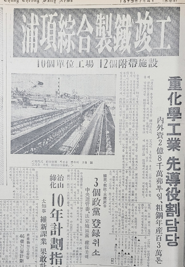 一貫工程(일관공정) 종합 工場(공장)으로서는 國內(국내) 最大(최대)이며 重化學工業(중화학공업) 건설에 획기적인 先導(선도) 역할을 담당하게 될 浦項(포항)종합제철공장 종합 竣工式(준공식)이 3일 하오 2시 三府(삼부) 요인과 주한 외교 사절 및 많은 관계자들이 참석한 가운데 浦項工場 現場(현장)에서 성대히 거행되었다.