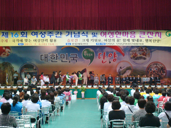▲ 단양군이 6일 문화체육센터에서 여성 화합을 위해 16회 여성주간 기념행사를 가졌다. © 편집부단양군이 6일 단양 문화체육센터에서인 여성의 화합을 위한 16회 여성주간 기념행사를 가졌다.단양군이 주최하고 단양군여성단체협의회가 주관한 이날 기념행사에는 조옥자 여성단체협의회장과 황봉수 단양군부군수 송광호 국회의원을 비롯해여성단체 대표와 회원, 군민 등 500여 명이 참여했다. '크게 키워요, 여성의 꿈, 함께 빛내요, 행복단양'을 슬로건으로 열린 이날 행사는 여성 발전 유공자 표창, 부부유공자 표창을 포함하는 여성주간 기념식, 웃음·행복이 묻어나는 사진 콘테스트 시상 등 다채로운 행사가 열렸다. /단양=오준석기자